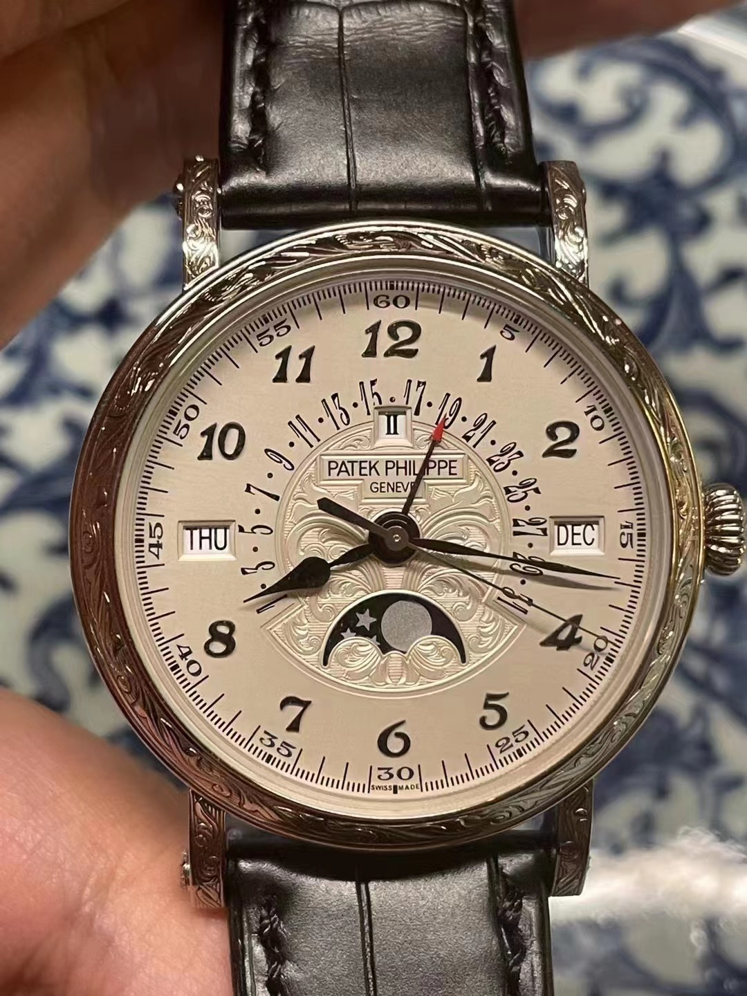 短评:5160是飞返万年历手表,早已被百达翡丽定性为超级复杂功能计时系列手表类别。这款表的表面及表身雕刻工序是由百达翡丽雕刻师人手设计及操作,几乎没有两个制成品是完全一样,所耗时间和精力甚多,这导致其生产数量极少。