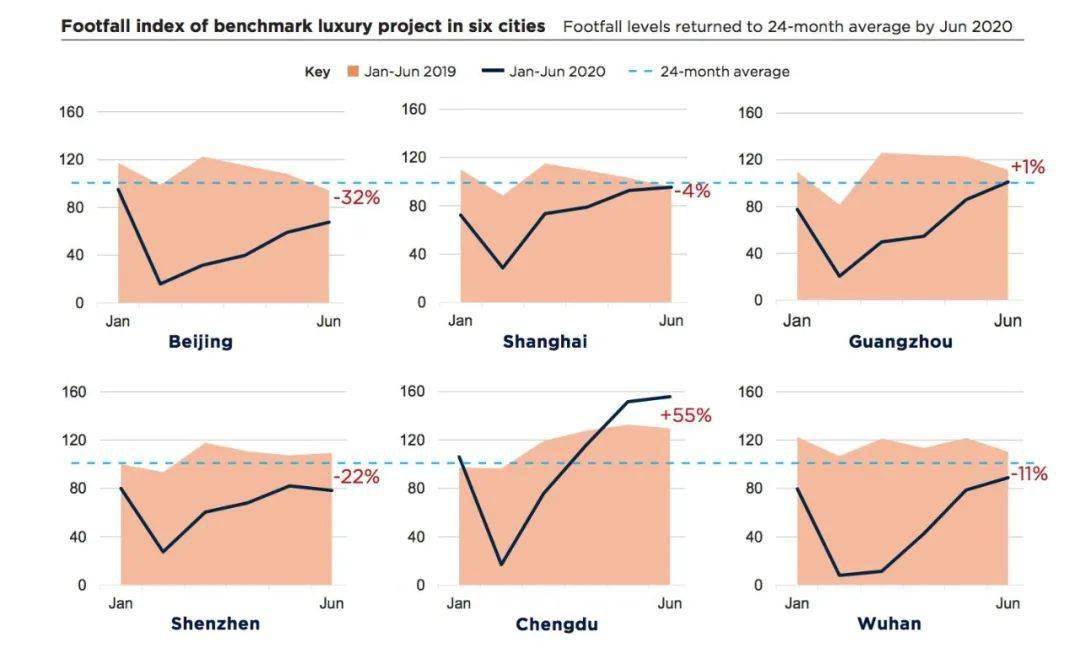 文中提到,在今年2月,疫情最严重的时期,国内北京、上海、广州、深圳、成都、武汉六大城市的顶级商场客流量往年平均水平跌了80%,但到3月已经开始回暖。