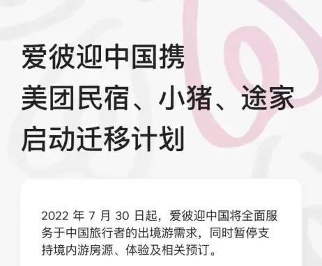 5月24日,爱彼迎中国宣布:于2022年7月30日起,暂停支持境内游房源、体验及相关预订,全面服务出境游。